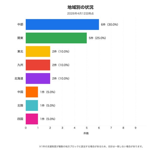 4月第2週の環境・省エネ関連支援は中部・関東に集中しており、この2ブロックで全20件のうち11件を占めています。