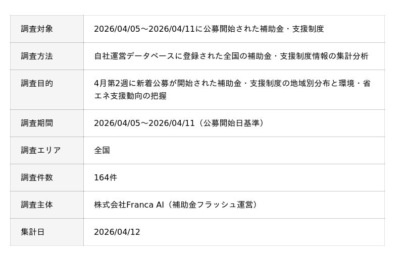 そこで株式会社Franca AI(本社:東京都中央区)が運営する支援制度検索ポータル「補助金フラッシュ」は、2026/04/05~2026/04/11に公募開始された補助金・助成金164件を集計分析しました。