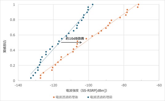 屋外におけるガラスアンテナからの受信電波強度の累積分布を用いて、同一エリアにおける前後比較を実施したところ、電波透過処理後の測定結果において、受信電波強度が中央値(累積割合0.5)で約