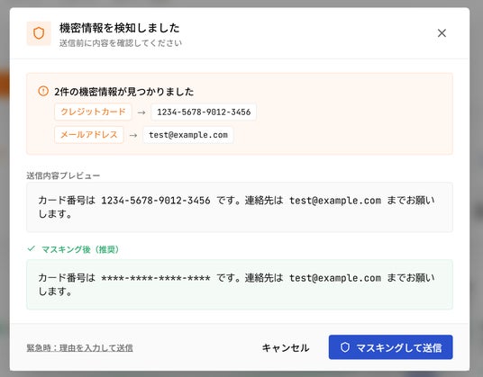 従業員がAIにプロンプトを送信する直前に、ブラウザ内でリアルタイムにデータをスキャンします。クレジットカード番号やメールアドレスなどの機密情報を検知した場合、送信を一時停止し、ワンクリックで「****」に伏せ字化(マスキング)して送信するよう提案します。これにより、従業員はプロンプトを書き直す手間なく安全にAIを利用できます。また、業務が止まることを防ぐため、理由を入力した上でそのまま送信できる「セルフ・オーバーライド機能」も備えています。