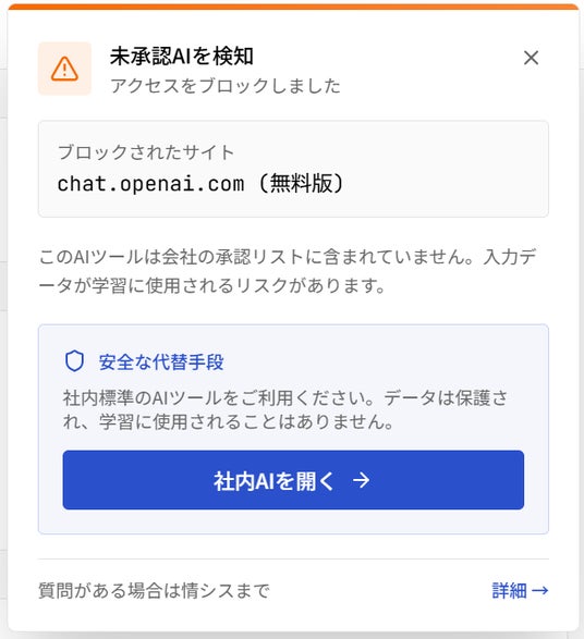 会社が許可していない未承認の無料AIツール等へのアクセスを検知・ブロックします。単に禁止するだけでなく、「代わりに社内標準のAIツールをご利用ください」という案内とともに安全な代替手段へのリンク(ナッジ)を提示することで、現場を迷わせることなく正しいツールへ誘導します。
