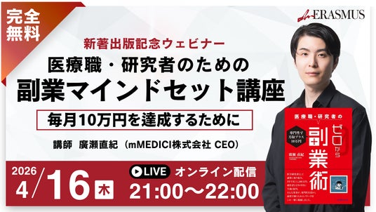 mMEDICI株式会社(本社:東京都、代表取締役:廣瀬直紀)は、医療職や研究者が自身の専門性を活かして副業を始めるための実践的ガイドブック『専門性で月収プラス10万円 医療職・研究者のゼロから副業術』(廣瀬直紀 著)が、中外医学社より2026年4月14日に発売されたことをお知らせいたします。本作は発売初日から大きな反響を呼び、Amazon.co.jpにおいて発売から半日で完売(一時的な在庫切れ)となりました。また、本書の出版を記念し、4月16日(木)に無料のオンラインウェビナーを開催いたします。
