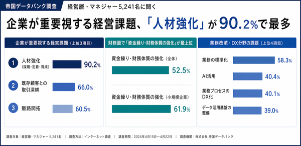 実際の調査でも、「人材強化」は90%超とダントツの1位。採用できない、定着しない、育たない——どの規模の企業でも共通する課題になっています。