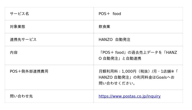 ポスタス株式会社(本社:東京都中央区、代表取締役社長:本田 興一、以下:ポスタス)が提供する飲食向けPOSレジ「POS+ food(ポスタス フード)」は、株式会社Goals(本社:東京都港区、代表取締役社長:佐崎 傑、以下:Goals)が提供する飲食企業向け需要予測型AI自動発注サービス「HANZO 自動発注」と連携を開始しました。
