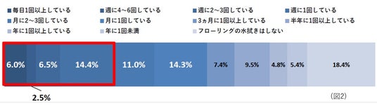 実際に、ダイソンが実施したフローリング掃除に関する意識調査によると、床掃除に水拭き掃除が重要だと感じている人は75.4%に上ります(図1)*²。一方で、週に1回以上実施すると回答した人は30%を下回る結果となり、ニーズに対して普及が十分に進んでいない現状が見られます(図2)*²。