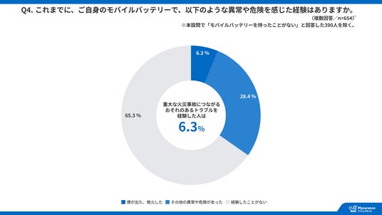 モバイルバッテリーの使用において異常や危険を「経験したことがない」と回答した人は65.3%となる一方で、その他の異常や危険(「異常に熱くなった」「膨張した」「焦げたようなにおいがした」「充電中に異音がした」)を経験した人も28.4%存在したほか、「煙が出た」「発火した」といった発煙・発火などの重大な火災事故につながるおそれのあるトラブルを経験した人は6.3%確認されました。