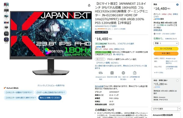 Amazon.co.jpにて、JAPANNEXTの23.8型フルHDゲーミングディスプレー「JN-Ei238G180F」が販売中だ。価格は1万6480円。