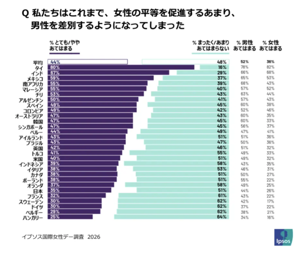 また、世界的には男性の間で「平等推進が行き過ぎている」「逆差別ではないか」という懸念も広がっており、男性の54%が「すでに十分な取り組みが行われている」と感じている一方、女性は38%にとどまりました。