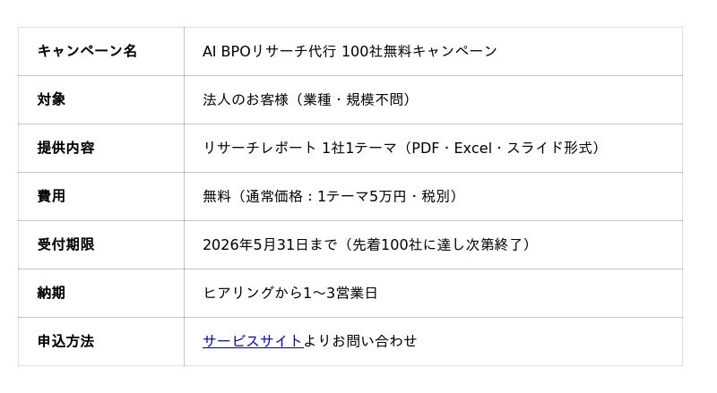 当社は2026年3月に「AI BPOリサーチ代行サービス」を開始し、プレスリリースの配信直後から多くの反響をいただきました。特に「まずは1テーマ、スポットで試したい」というニーズが想定以上に大きかったことを受け、初めてのお客様がリスクなくサービスの品質を体験できる本キャンペーンの実施を決定いたしました。