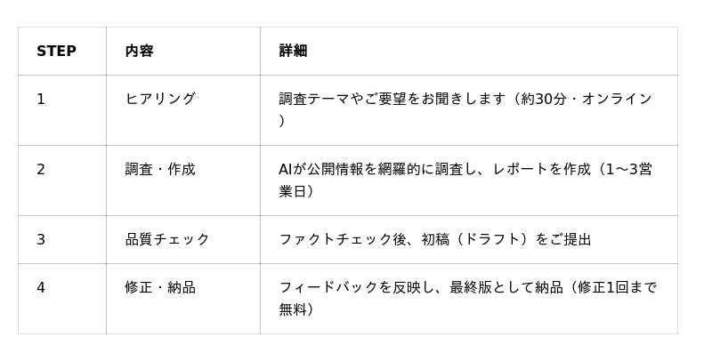 調査テーマをお伝えいただくだけで、情報収集から分析・レポート作成までを一括で実施。ヒアリングから1~3営業日で納品いたします。