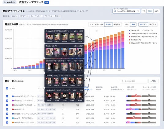 本アップデートにより、過去の蓄積データだけでなく「今まさに出稿を強化している広告」に焦点を当てた分析や、期間を絞った出稿トレンドの変化を瞬時に把握できるようになり、競合のデータ分析に膨大な時間を掛けているマーティングチームから、提案資料を作成する広告営業の現場まで幅広い実務を強力にサポートします。