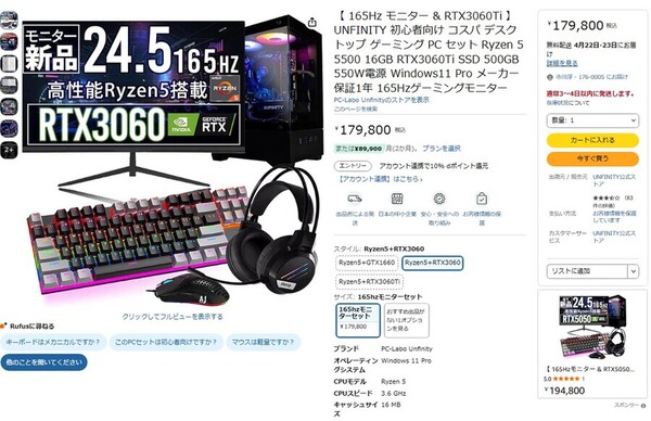 Amazon.co.jpにて、「【 165Hz モニター & RTX3060Ti 】 UNFINITY 初心者向け コスパ デスクトップ ゲーミング PC セット」が販売中だ。価格は17万9800円。
