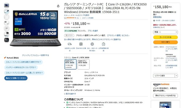 Amazon.co.jpにて、GALLERIAの15.6型フルHDゲーミングノートPC「GALLERIA RL7C-R35-5N」が販売中だ。過去価格は16万9080円だが、執筆時点では6%オフの15万8180円で購入できる(4月15日時点)。
