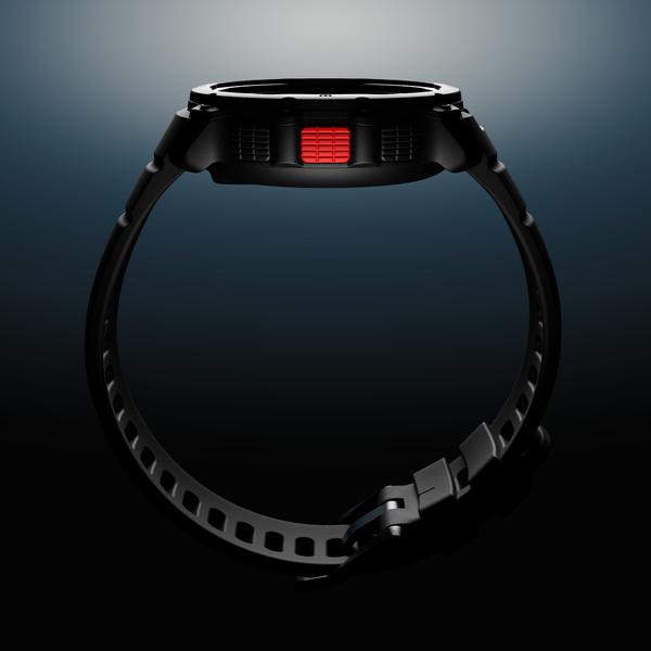 このゴツめの外観から想像すると、さぞかしズッシリ重いんだろうな……と思いきや、腕に巻いた瞬間にその予想はいい意味で裏切られます。ストラップを含めてもわずか48gという超軽量設計なんです。