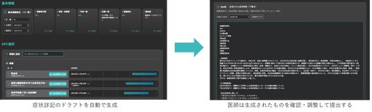 “症状詳記作成支援プログラム”では、生体情報や電子カルテのデータをAIが解析し、症状詳記のドラフトを自動で生成します。このプログラムを活用することで、症状詳記の作成時間がこれまでの約4分の1におさえられ(※5)、医師の大幅な負担軽減に繋がるほか、診療報酬の請求漏れ防止の効果も期待されます。