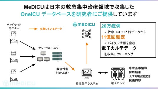 世界最大規模の救急・集中治療のデータベース“OneICU”を提供する株式会社MeDiCU(本社:大阪府大阪市、代表取締役:木下 喬弘、以下「MeDiCU」)は、学校法人関西医科大学(大阪府枚方市 理事長・山下 敏夫、学長・木梨 達雄、以下「関西医科大学」)に、ICUに入室する患者さんの退室判断を支援するMeDiCU-AI“退室・転棟支援プログラム”と、医師の書類作成を効率化する“症状詳記作成支援プログラム”の提供を開始いたします。このような多施設の大規模医療データを学習したAIでICU患者の退室判断を支援するプログラムの導入事例は、世界的に見ても極めて稀であり、国内でははじめての取り組みとなります(※1)。