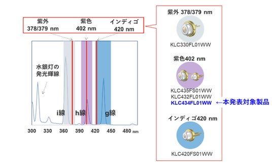 水銀灯の発光輝線であるi線 (365nm) 、h線 (405nm) 、g線 (436nm) を代替する当社半導体ラインナップの呼称。紫外半導体レーザ (378/379nm) や紫色半導体レーザ (402nm) 、インディゴ半導体レーザ (420nm) を組み合わせた使用を提案