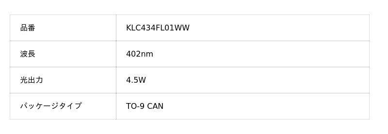 (*1) 2026年4月15日現在当社調べ 波長402nmで連続発振 (CW) 、ケース温度 (Tc) 25℃条件下、TO-9 CANパッケージ半導体レーザにおいて