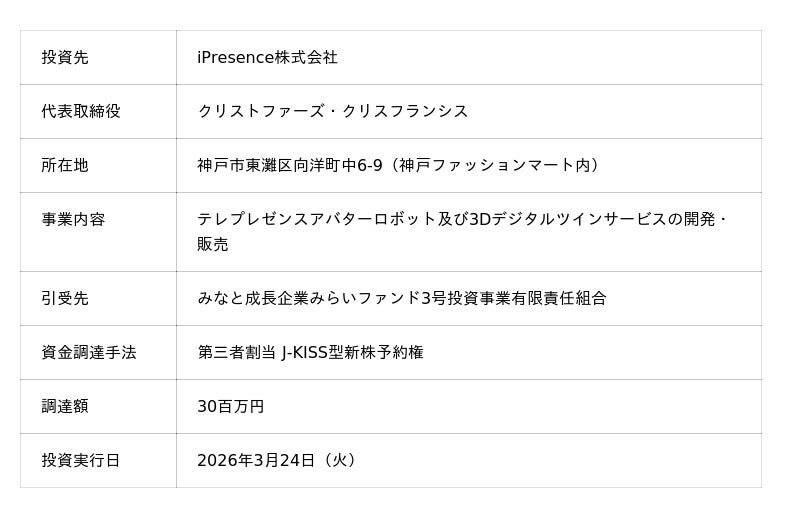 iPresence株式会社(本社:神戸市東灘区、代表取締役:クリストファーズ・クリスフランシス、以下「当社」)は、りそなグループの株式会社みなと銀行、りそなキャピタル株式会社、みなとキャピタル株式会社の3社が共同で設立した「みなと成長企業みらいファンド3号投資事業有限責任組合」より、2026年3月24日付で出資を受けたことをお知らせいたします。