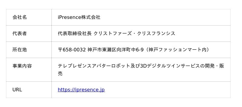iPresence株式会社は、「より良きコミュニケーション文化の普及による顧客・社員の社会的進歩と自己実現、日本のものづくり業界への貢献」をミッションに掲げ、2014年の創業以来、神戸を拠点にテレプレゼンスアバターロボットとデジタルツイン分野のパイオニアとして事業を展開するロボットベンチャー企業です。