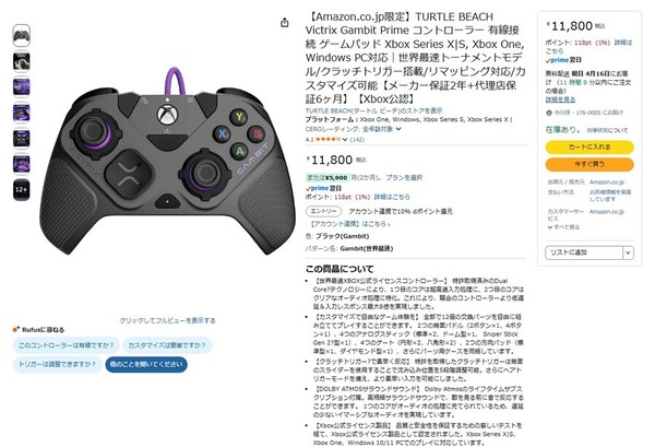 Amazon.co.jpにて、TURTLE BEACHのXbox・PCコントローラー「【Amazon.co.jp限定】TURTLE BEACH Victrix Gambit Prime」が販売中だ。価格は1万1800円。