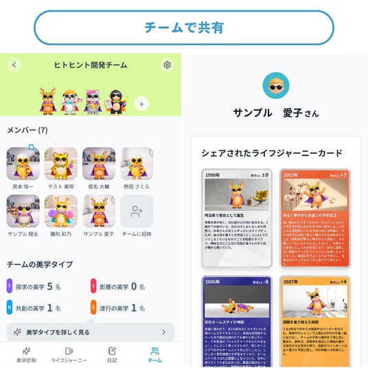 可視化された価値観や人生経験を、個人で終わらせず、チーム内の相互理解につなげられる設計です。