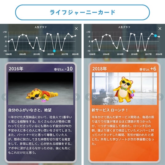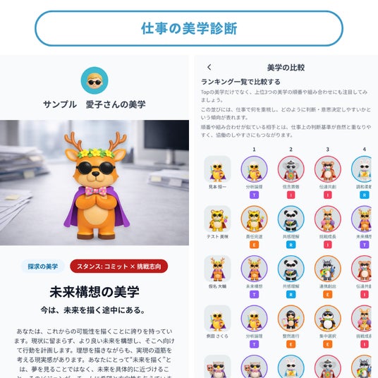 「仕事の美学診断」では、まずはライトに仕事において大切にしている価値観を楽しみながら可視化。「ライフジャーニーカード」では、印象的な人生経験をカードにすることで、特許取得済のAIパーソナル分析機能が強みや価値観、モチベーションの源泉を整理し、自分らしさの理解を深めます。
