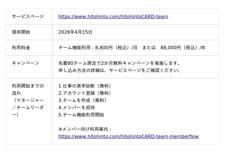 自己理解・相互理解促進AIツール「ヒトヒント」を提供する株式会社hitohinto(本社:東京都渋谷区、代表取締役:大野 千香)は、2026年4月15日、メンバーのキャリアデザイン、チームの深い相互理解、個を活かすマネジメントの継続を一体で支援する新しいピープルマネジメントツール「ヒトヒントCARD for チーム」の提供を開始します。