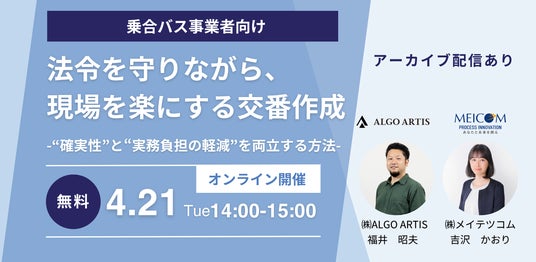 株式会社メイテツコム(本社:愛知県名古屋市、代表取締役社長:山田 和利)は、AIによるプロダクト開発を行う株式会社 ALGO ARTIS(本社:東京都千代田区、代表取締役社長:永田 健太郎)と共同で、2026年4月21日(火)に乗合バス事業者様向け無料ウェビナー「法令を守りながら、現場を楽にする交番作成」を開催いたします。
