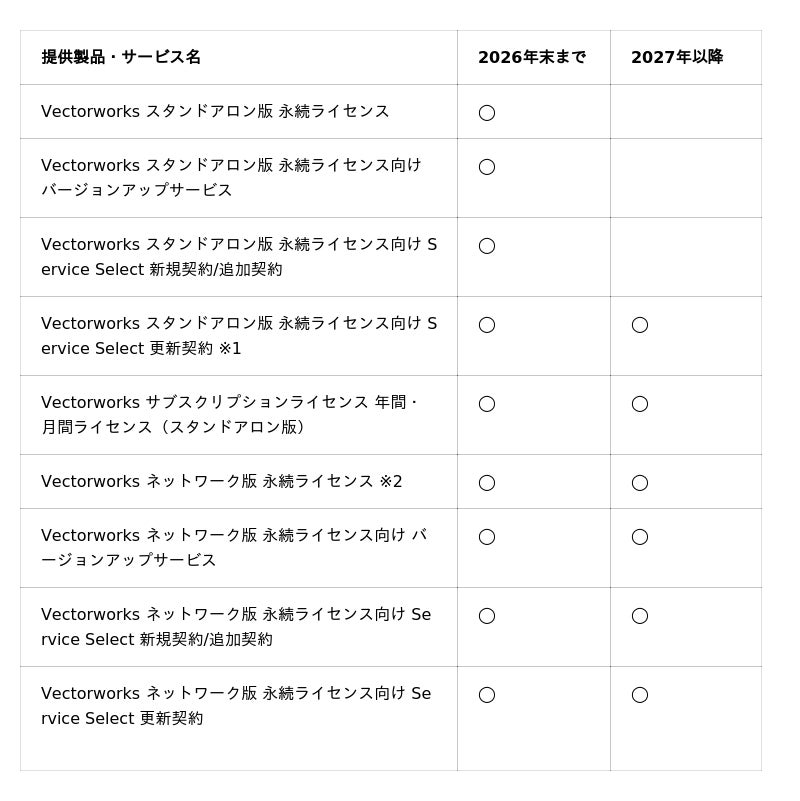 デザインおよびBIMソフトウェアのプロバイダであるVectorworks, Inc.の日本法人ベクターワークスジャパン株式会社(所在地:東京都新宿区、代表取締役社長:横田貴史)は、2026年末をもって、「Vectorworks スタンドアロン版 永続ライセンス」の販売およびスタンドアロン版 永続ライセンス向けの「バージョンアップサービス」と年間保守サービス「Vectorworks Service Select(以下、Service Select)」の新規契約、追加契約の受付を終了することを発表しました。