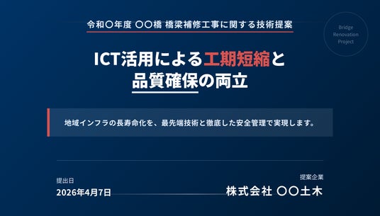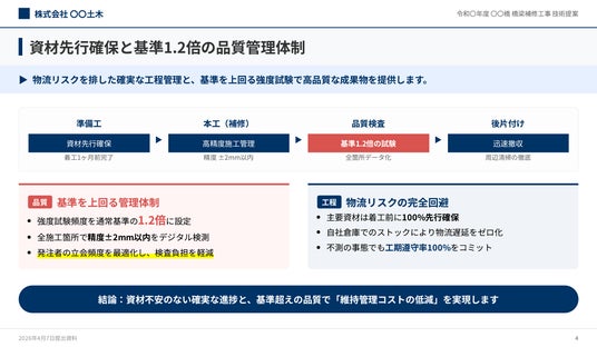 3つ目は「入札対応の技術提案スライド」です。公共・民間の発注者を対象に、技術提案・施工計画・安全対策をまとめた入札用スライドを生成できるサンプルです。複数の入札案件が重なると、技術提案書のスライド作成リソースが不足し、品質を維持しながら期限内に仕上げることが難しくなるという課題に対応しています。技術資料PDFや安全計画書を素材として投入するだけで、入札用の技術提案スライドを作成でき、入札案件ごとに発生する提案書作成の負担を軽減しながら、品質と納期の両立を支援します。