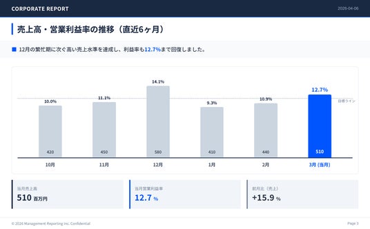 2つ目は「経営数値・社内展開スライド(グラフ付き)」です。経営層・全社員を対象に、月次の経営数値やKPIを棒グラフ・折れ線グラフ・アイコン付きで可視化したスライドを生成できるサンプルです。月次の経営報告をグラフ付きスライドで共有したいものの、経営数値をグラフやチャートに落とし込む作業に手間がかかり、定例資料であっても毎回の制作工数が大きいという課題に対応しています。テキストベースの骨組みをもとに、経営数値・KPIを視覚的に可視化したスライドを自動生成でき、月次経営会議や全社共有の場で活用することで、定例報告資料の制作負担を継続的に軽減できます。
