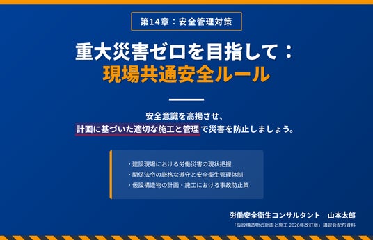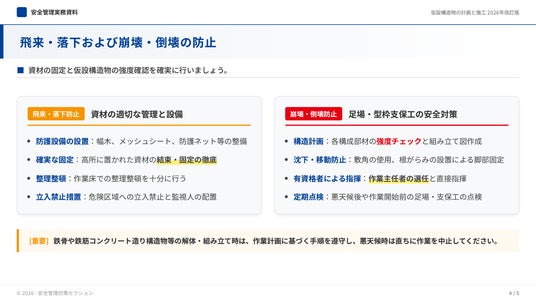 4つ目は「全現場統一の安全教育スライド」です。全現場の作業員・協力会社を対象に、安全基準・事故防止ルールを統一フォーマットでまとめたスライドを生成できるサンプルです。1つのベース安全教育コンテンツを全現場に展開したいものの、現場別の設備・工法に合わせた差し替えに手間がかかり、全現場での品質統一が難しいという課題に対応しています。安全基準書PDFを素材として投入するだけで、安全基準・事故防止ルールを統一フォーマットでまとめたスライドを作成でき、安全大会や新規現場着手時に活用することで、全現場での安全教育の品質を均一化できます。