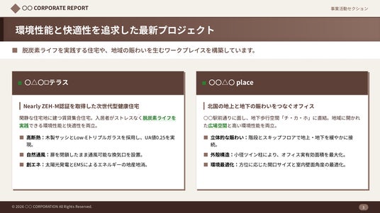 建設会社・工務店・設備工事会社など、建設業界のさまざまなシーンでの活用を想定したサンプルスライドを用意しており、専門的なデザインスキルがなくても、高品質な提案資料・教育コンテンツを制作することが可能です。