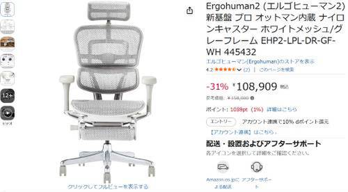 エルゴヒューマンのオフィスチェア「Ergohuman2 新基盤 プロ オットマン内蔵(EHP2-LPL-DR-GF-WH)」がAmazonで割引対象。参考価格158,000円のところ、31%オフの108,909円で販売中。
