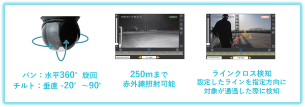 また、AIが映像内の動きを解析して異常兆候を自動で捉える機能を搭載。指定エリアへの侵入を検出する「侵入検知」や特定エリアに長時間滞留する対象を検出する「滞留検知」、決められた方向への移動を検出する「方向検知」、設定したラインを横断した対象を検出する「ラインクロス検知」を行うという。