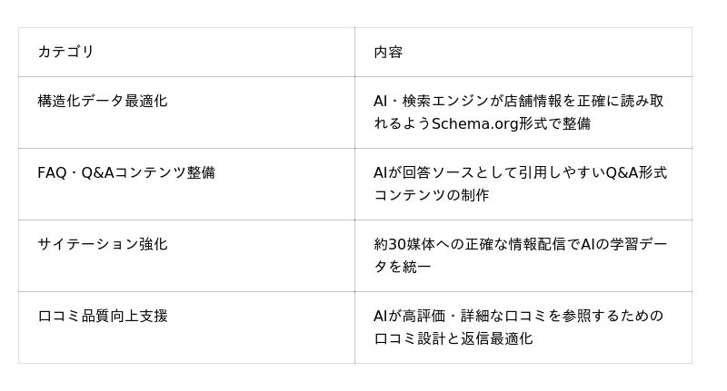 ChatGPT・Geminiなどの生成AIによる検索回答で「名指し推薦」される店舗を目指す、AEO(Answer Engine Optimization)対応サービスとして店舗事業者向けに展開