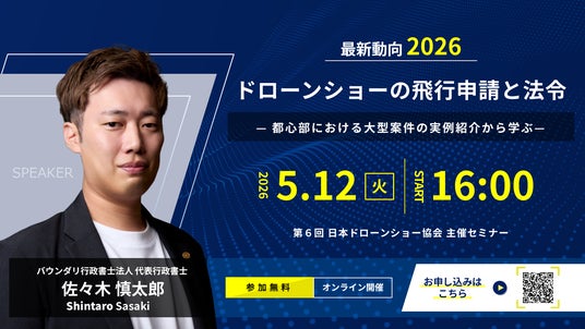 【5月12日開催】日本ドローンショー協会主催「最新動向2026 ドローンショーの飛行申請と法令」ウェビナーに、バウンダリ行政書士法人 代表・佐々木慎太郎が登壇