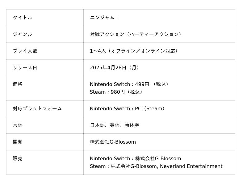 「新たなおもしろさを開花させよ!」をビジョンとして掲げる株式会社G-Blossomは、Nintendo Switch向け3Dアクション対戦ゲーム『ニンジャム!』を2026年4月16日(木)にリリースいたしました。