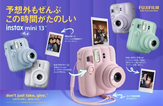 当社は、撮ったその場ですぐにプリントが楽しめるinstax(TM)”チェキ”シリーズのエントリーモデルとして「instax mini 13(TM)」(以下、「mini 13」)を2026年4月24日に発売します。「mini 13」は、シンプルな操作で誰でも簡単・きれいに、狙い通りの撮影ができる「instax mini 12(TM)」を、デザイン・機能ともに進化させたアナログインスタントカメラです。カメラ本体は、ファッションアイテムとしても持ち歩きたくなるようなぷっくりとした立体感が特長のポップなデザインに仕上げました。