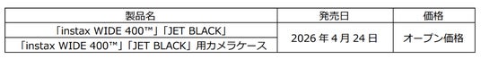富士フイルム株式会社(本社:東京都港区、代表取締役社長・CEO:後藤 禎一)は、instax(TM)“チェキ”のアナログインスタントカメラ「instax(インスタックス) WIDE(ワイド) 400(フォーハンドレッド)(TM)」(以下「WIDE 400」)の新色 「JET(ジェット) BLACK(ブラック)」を2026年4月24日より発売します。また、本体カラーに合わせたカメラケースを同時発売します。
