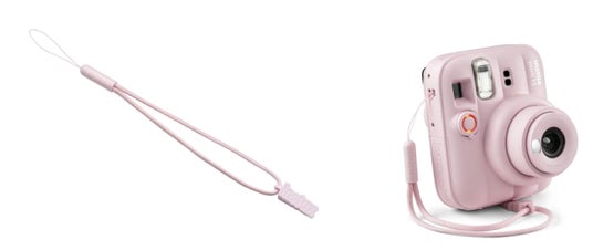 同梱のハンドストラップに付いているinstax(TM)ロゴのパーツは「カメラ角度調整アクセサリー」として使用でき、三脚がなくてもカメラを置いて手軽にセルフタイマーで撮影できます。