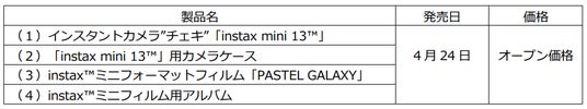富士フイルム株式会社(本社:東京都港区、代表取締役社長・CEO:後藤 禎一)は、撮ったその場ですぐにプリントが楽しめるinstax(TM)”チェキ”シリーズのエントリーモデルとして「instax(インスタックス) mini(ミニ) 13(サーティーン)(TM)」(以下、「mini 13」)を2026年4月24日に発売します。「mini 13」の本体カラーに合わせたカメラケースと、一枚ずつ異なる鮮やかな色彩と光沢感で写真を華やかに見せるミニフォーマットフィルム「PASTEL(パステル) GALAXY(ギャラクシー)」、instax(TM)ミニフィルム用アルバムも同時発売します。