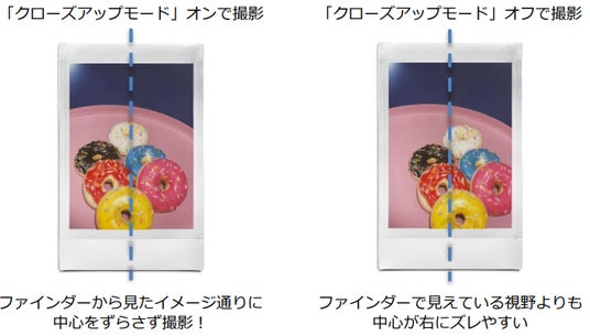 「mini 12」でご好評いただいている、「クローズアップモード」と「オート露光機能」を搭載。誰でも簡単・きれいに狙い通りの撮影が可能です。接写や自撮りに最適な「クローズアップモード」には、接写の際にファインダーから見える視野を実際のプリントに写る範囲に合わせる機能(パララックス補正)も搭載しており、ファインダーでとらえた中心をずらさず、簡単に撮影できます。また、シャッタースピードやフラッシュ光量を自動調整する「オート露光機能」により、撮影シーンに合わせた最適な明るさで撮影できます。