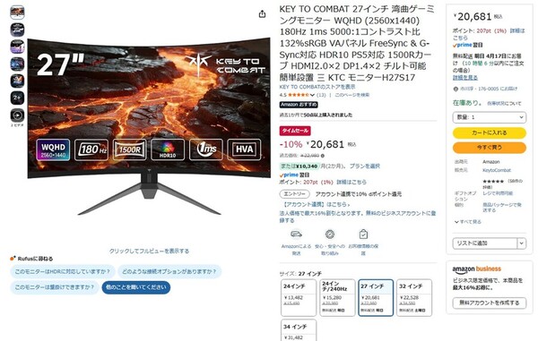 Amazon.co.jpにて、KTCの27型湾曲ゲーミングディスプレー「H27S17」が販売中だ。過去価格は2万2980円だが、タイムセールにより10%オフの2万681円で購入できる(4月16日時点)。