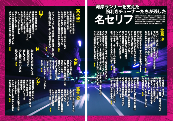 クリアファイルを挟み込む8ページの小冊子も付属する。内容は、アキオの「悪魔のZ」と交錯する湾岸ランナーや、物語を支えるクセのあるチューナーたちの紹介に加え、「湾岸ミッドナイト」ならではのチューナーたちの名セリフ集で構成される。