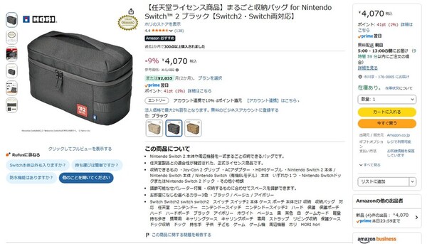 Amazon.co.jpにて、ホリの「【任天堂ライセンス商品】まるごと収納バッグ for Nintendo Switch 2 ブラック【Switch2・Switch両対応】」が販売中だ。参考価格は4480円だが、執筆時点では9%オフの4070円で購入できる(4月16日時点)。
