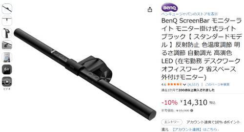 BenQ ScreenBar モニターライトがAmazonで割引対象。参考価格15,900円のところ、10%オフの14,310円で販売中。