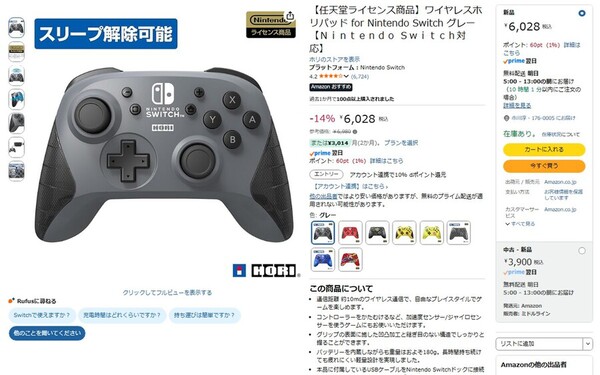 Amazon.co.jpにて、ホリの「【任天堂ライセンス商品】ワイヤレスホリパッド for Nintendo Switch グレー」が販売中だ。参考価格は6980円だが、執筆時点では14%オフの6028円で購入できる(4月16日時点)。