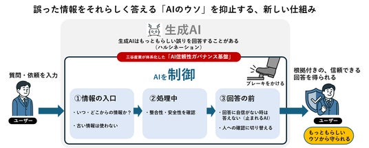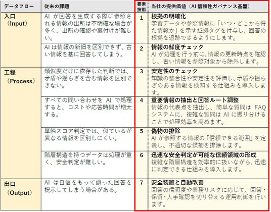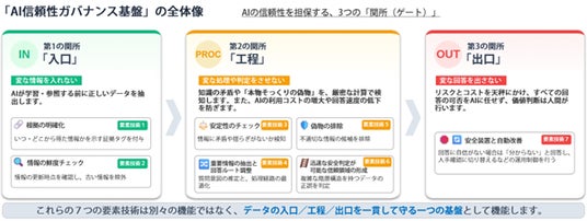 こうした課題に対し、当社が体系化した「AI信頼性ガバナンス基盤」は、情報の「入口/工程/出口」を段階的に管理し、情報の出所や時点(鮮度)、意味構造との整合性といった多面的な観点からAIの処理プロセス全体を制御する仕組みです。この仕組みにより、AIが誤った前提のまま回答するリスクを運用面で抑えます。